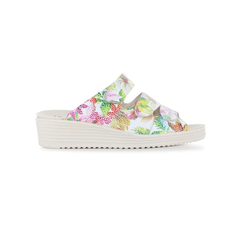 Idéales à ajuster à chacun de vos pieds grâce à leurs trois brides Velcro, les mules Velcro KIRSTEN 50003 de la marque SOLIDUS sont aussi parfaitement adaptées pour les pieds très larges. Disposant d’un très agréable talon compensé très stable, vous vous assurez un véritable confort de marche au quotidien. Vous apprécierez aussi ces mules femme pour la qualité des matières proposées et par leur confection. De plus, elles disposent d’une semelle intérieure amovible avec soutien plantaire en composite et matelassage sous points de pression.